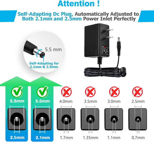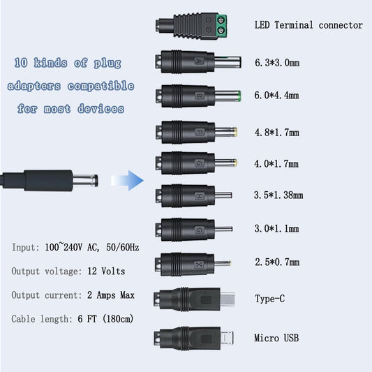 12V 2A Power Supply AC Adapter with 10 Tips, Regulated 12 Volts 2000mA Replacement Charger Cord - Ideal for LED Strip Light, CCTV Camera, BT Speaker, GPS, Webcam, Router - DC 12V Transformer (6ft)