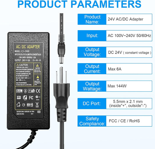 24V 6A LED Power Supply Adapter with 5.5x2.1mm Jack - AC to DC Converter for Various Devices