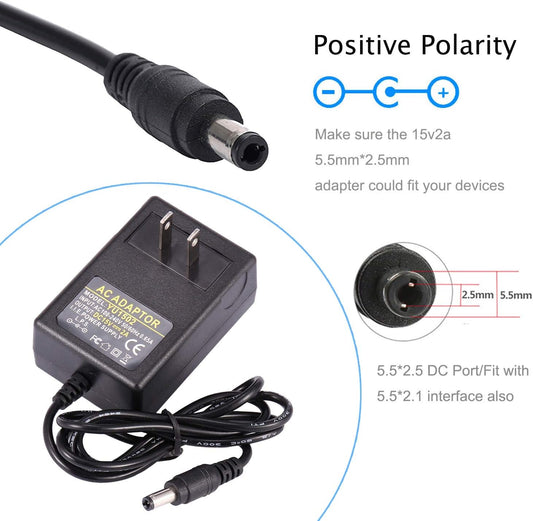 COOLM 15V 2A Power Supply Adapter with 5.5x2.5mm Interface - AC 100-240V 50-60hz DC Charger Transformer for 15 Volt Devices