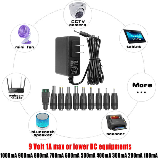 Universal 9V Power Supply Adapter with 10 Interchangeable Jacks - AC to DC Wall Charger Cord for Electronics - 1000mA to 100mA