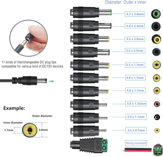 Universal DC15V 3A Power Supply with 11 DC Plug Tips - AC120V to DC15V 3000mA Charger Adapter