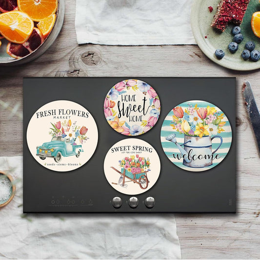 Floral Farmhouse Electric Stove Burner Covers Set - 4 Pcs, 8" and 10", Gas Cooktop Cover for Kitchen Decor, Metal Flowers Decorations