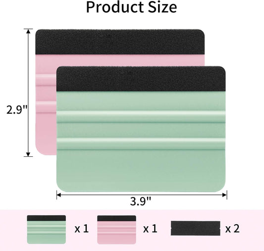 Vinyl Squeegee Set with 2 Felt Replacements - 4 Inch Tools for Car Wrap, Sign Making, Window Tinting - Teal/Pink