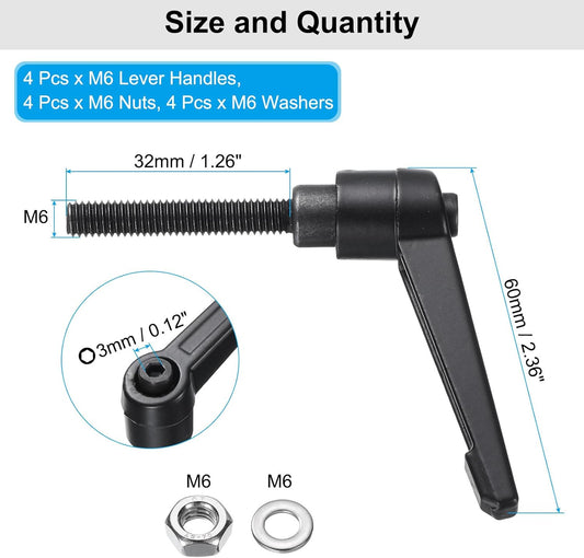 4pcs M6 x 32mm Lever Adjustable Handles Set with Nuts Washers, Rotating Screw Knobs, Black