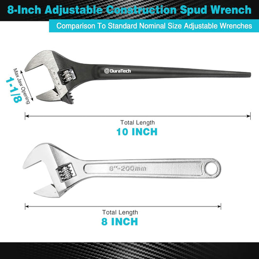 8-Inch DURATECH Spud Wrench with Adjustable Design, Black Oxide Finish, CR-V Steel, SAE and Metric Scale, Alignment Holes, Tail Crowbar