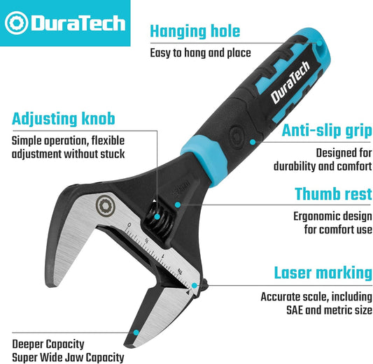 Adjustable 8-Inch Plumbing Wrench with Wide Jaw Opening, DURATECH Heavy-Duty CR-V Steel, SAE and Metric Scale, Ergonomic Grip