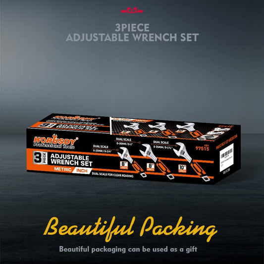 Adjustable Wrench Set 3-Piece - 6-Inch, 8-Inch, 10-Inch - Metric & SAE Scales - Wide Jaw Crescent Wrenches Set