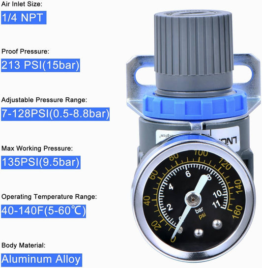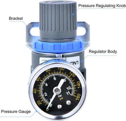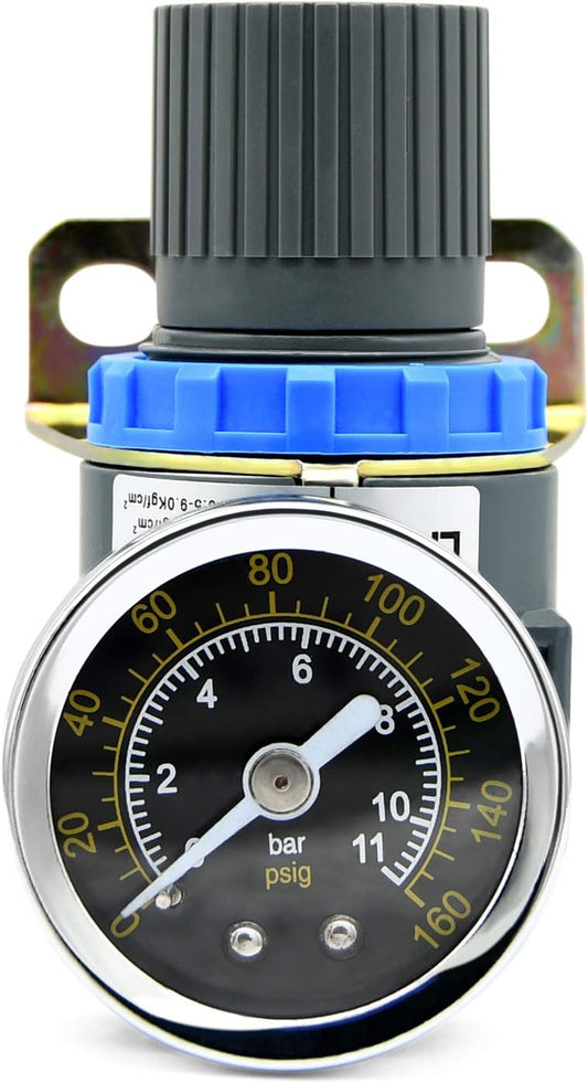 Mini Air Pressure Regulator with Gauge for Air Compressor or Tools - 1/4 Inch NPT Thread, 0-145 PSI