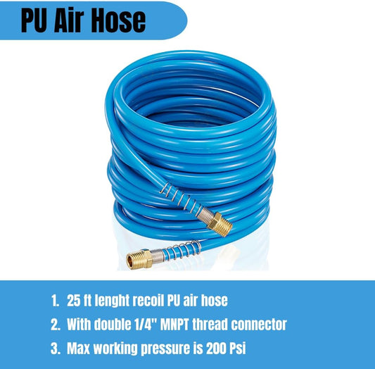 Pneumatic Air Compressor Accessory Kit with 25ft Coiled Hose, Blow Gun, Tire Gauge, Air Nozzle - Air Tool Set for Inflation & Dusting