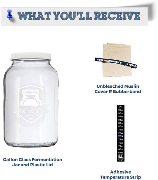 1 Gallon Glass Kombucha Jar Kit with Brew Notes - Includes Muslin Cover, Rubber Band, Marker, and Lid - Ideal Home for SCOBY