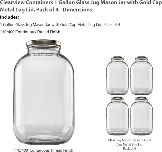 1 Gallon Glass Wide Mouth Jar with Gold Cap Metal Lug Lid - Clearview Containers, 128oz, 4 Pack