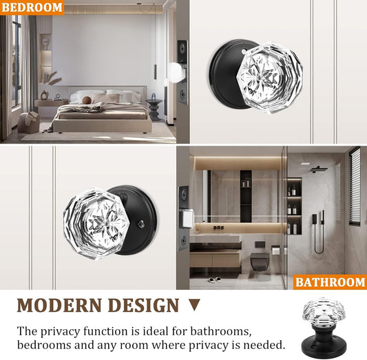1 Pack Glass Door Knob with Black Rosette for Privacy Use, Keyless Interior Handle - Diamond Shape Crystal Glass