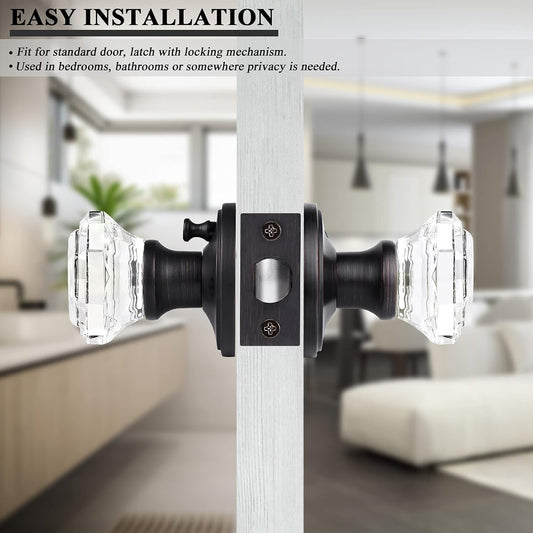 1 Pack Octagon Clear Crystal Bed/Bath Door Knob with Pin Lock, Oil Rubbed Bronze Back Plate, Keyless Glass Interior Door Knob