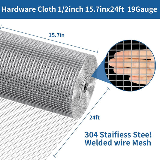 1/2 inch 19 Gauge 304 Stainless Steel Welded Wire Mesh Hardware Cloth - Chicken Wire Fence for Poultry, Garden, Plant Support - 15.7in x 24ft Cage & Containment Fence