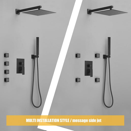 12 Inch Rain Shower Head System with Full Body Jets, Wall Mounted High Pressure Rainfall Shower Faucet Combo - Matte Black