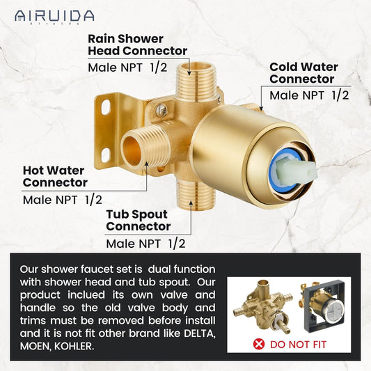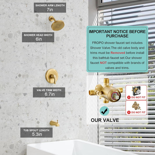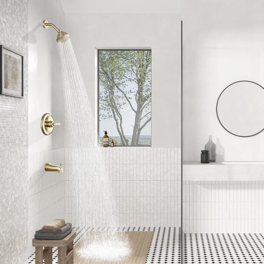 Brushed Gold Shower Tub Faucet Set with Valve - High-Pressure Shower Head and Handle Set, 6 Inch Rain Shower Head and Tub Spout - Complete Shower Faucet Kit