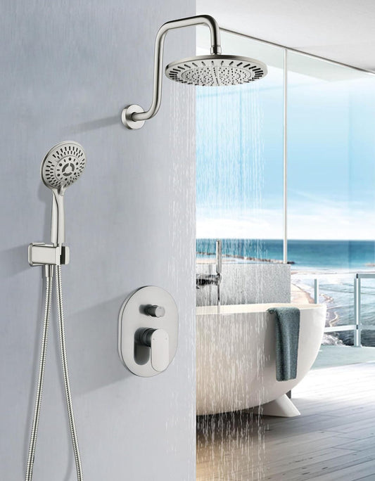 GGStudy Brushed Nickel Shower Faucet Set with Single Function Trim Kit and Rough-in Valve - 8inch Round Stainless Steel Metal Shower Head for Rainfall Bath Experience