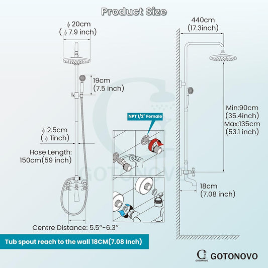 Brushed Nickel Shower System with 8 Inch Rainfall Showerhead, Tub Spout, and Cross Handles - gotonovo Exposed Faucet Set
