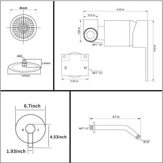 Brushed Gold Shower Faucet Set with 8" Stainless Steel Rain Shower Head & Solid Brass Valve