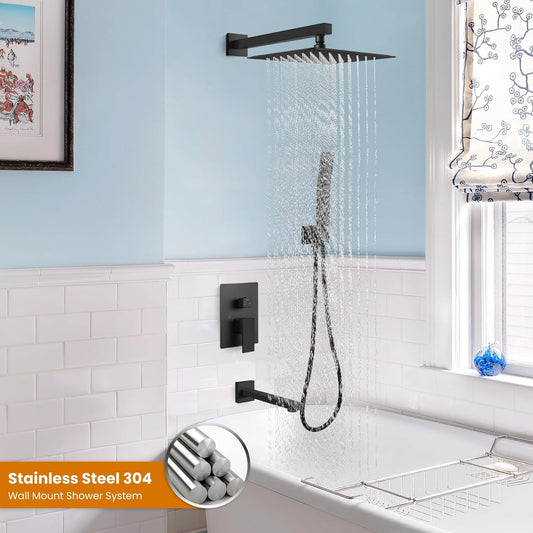 Matte Black Shower System Set with Tub Spout, Rainfall Head, Handheld Spray - 3 Function Wall Mounted Faucet Combo - Rough-in Valve - 10 Inch