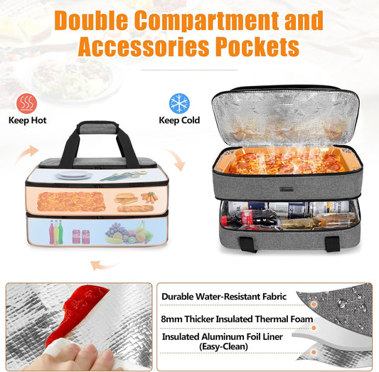 Grey Trunab Casserole Carrier Double Decker Thermal Tote Bag for Hot/Cold Food - Fits 9"×13" Baking Dish - Picnic Insulated Casserole Dish Carrier with Tool Room