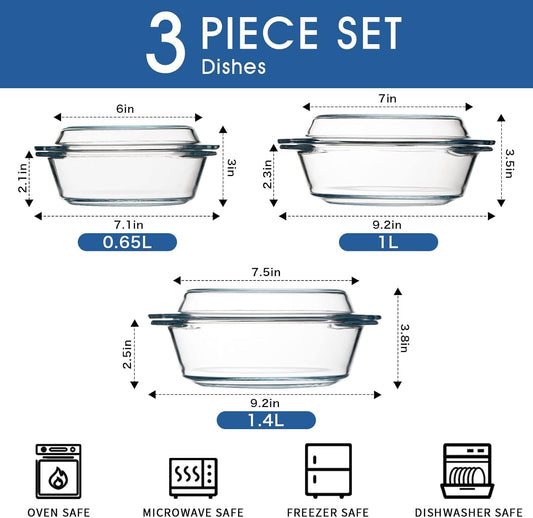 Set of 3 NUTRIUPS Round Glass Casserole Dishes with Lids - Cookware Set for Baking and Serving, Glass Casseroles in Various Sizes