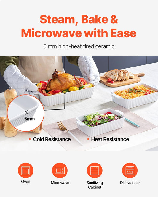 VEVOR 9x13 Ceramic Baking Dish Set of 3 - Rectangular Casserole Pans with Handles, Oven Safe Lasagna Pans for Cooking, Thanksgiving, White