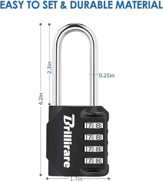 2 Pack BRILLIRARE Combination Locks, 4-Digit Padlock with Long Shackle, Waterproof Zinc Alloy for Outdoor Travel - Black/Silver