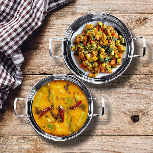 Set of 2 Stainless Steel Kadhai with Induction Bottom - Gas Stove Compatible - Sizes 12 (1.9 L) & 13 (2.3 L)