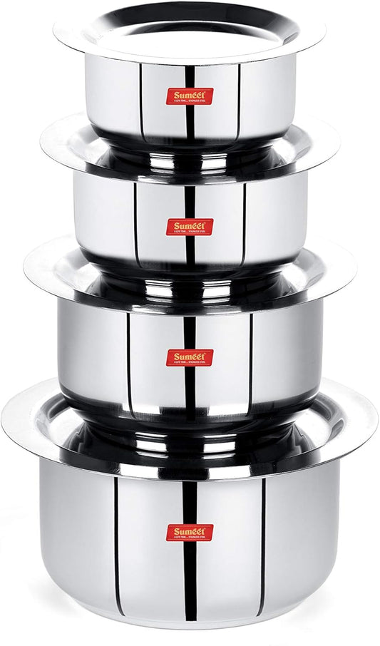 Set of 4 Stainless Steel Mini to Small Size Tope/Patila/Cookware with Lids - Induction & Gas Stove Friendly (370ML, 550ML, 800ML, 1100ML)