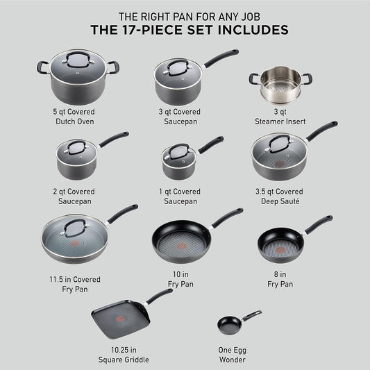 T-fal 17-Piece Hard Anodized Nonstick Cookware Set - Oven and Broiler Safe, Kitchen Cooking Set with Fry Pans, Saucepans, Saute Pan, and Griddle - Dishwasher Safe Black