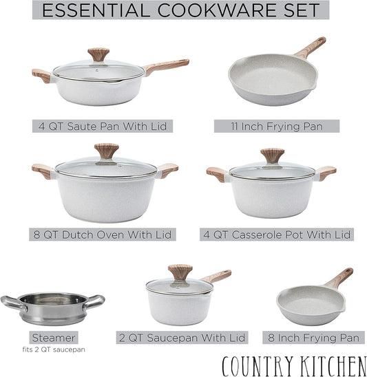 7 Piece Country Kitchen Cookware Set with Steamer, Frying Pans, and 14 Piece Utensils Bundle