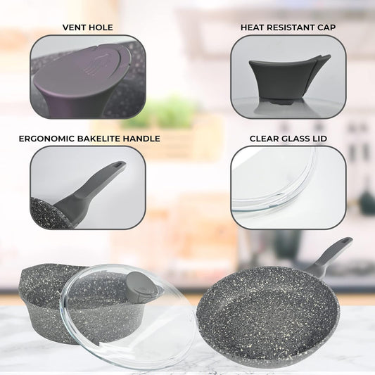 Karaca 7-Piece Non-Stick Granite Induction Cookware Set - PFOA Free, Dishwasher-Safe Pot and Pan Set with Glass Lids - Rose Color