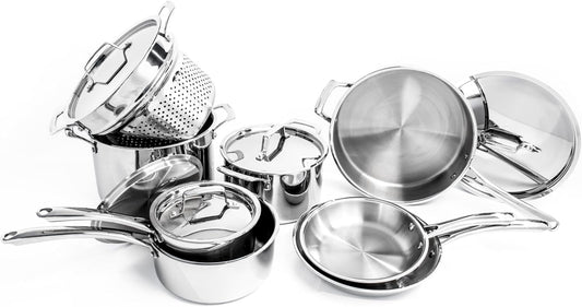 BergHOFF Professional Tri-ply Stainless Steel Cookware Set - 13Pc with Matching Lid, Safe Grip Handle, Induction Cooktop, Measurement Markings, Fast & Even Heat, Oven/Dishwasher Safe