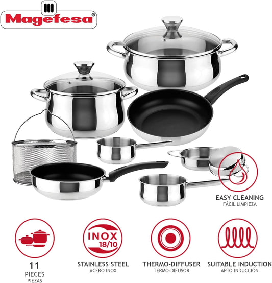 MAGEFESA IDEAL Stainless Steel Cookware Set - 11 Pieces for All Stovetops, Induction Ready & Dishwasher Safe