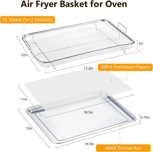 18.7" Oven Air Fryer Basket with Baking Tray, Stainless Steel Accessories Kit incl. 50pcs Air Fryer Paper - Air Fryer Guidance Included