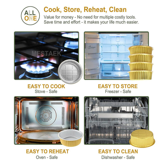 20-Pack MESTAEK Reusable Aluminum Foil Air Fryer Pans - 7.1" Diameter, 1.6" Depth, 24.5oz Capacity - Food-Grade, Black & Gold, Thickened for High Temperatures - Dishwasher Safe