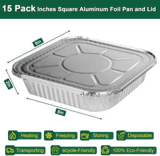 15 Pack Alfolic 8x8 Square Disposable Aluminum Foil Pans with Lids - Perfect for Air Fryer, Oven, and Cooking