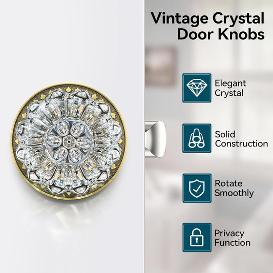 Antique Brass Crystal Glass Door Knobs with Lock, 5 Pack for Bedroom Bathroom - Vintage Calzibeno Interior Door Knob