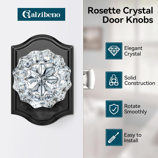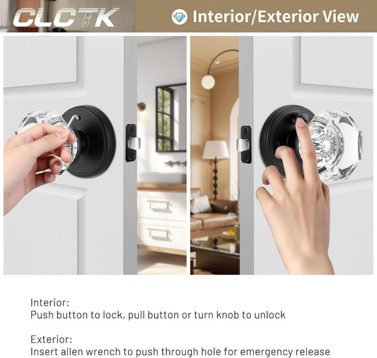 Octagon Crystal Glass Door Knobs Interior Lock Set - Matte Black Privacy Round Knobs for Bedroom Bathroom