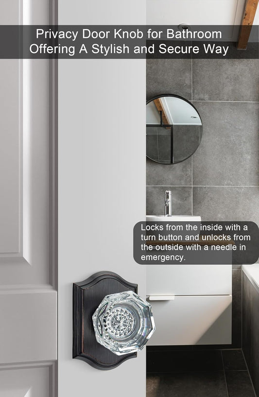 1 Pack Octagon Clear Crystal Bed/Bath Door Knob with Pin Lock, Oil Rubbed Bronze Back Plate, Keyless Glass Interior Door Knob