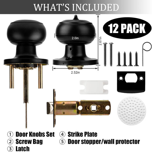 12 Pack Matte Black Privacy Door Knobs Set - Keyless Interior/Exterior Lockset with Hardware and Wall Protector - Ideal for Bedroom/Bathroom
