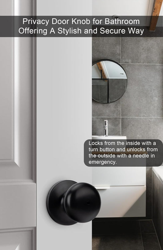 Stainless Steel Privacy Door Knob (2 Pack) for Bedroom and Bathroom - Keyless Round Ball Handle Locks in Matte Black