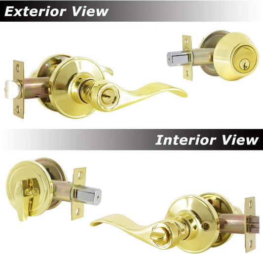 4 Pack Keyed Alike Entry Door Lock Set with Polished Brass Wave Lever Handle - Ideal for Bedroom, Front & Exterior Doors