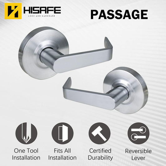 Commercial Grade HISAFE Heavy Duty Passage Door Lever in Satin Chrome Finish, UL 3 Hour Fire Rated for School/Hotel Hallways