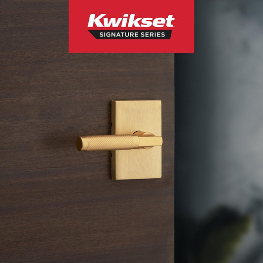 Satin Brass Kwikset Prava Interior Privacy Door Lever with Lock for Bathroom and Bedroom, Reversible Keyless Push Button with Microban Protection