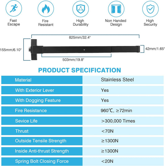 Commercial Grade Stainless Steel Panic Exit Device with Handle Lever for 32"-47" Wooden/Metal Doors - Heavy Duty Black Door Push Bar for Emergency Exits