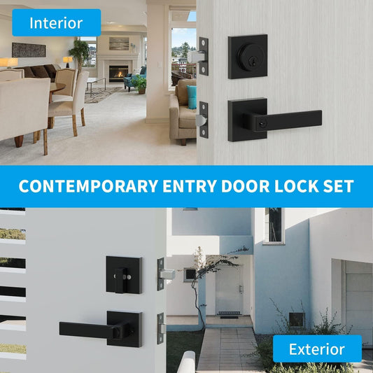 Heavy Duty Square Matte Black Door Lock Set with Keyed Entry Handle and Single Cylinder Deadbolt Combo - 2 Pack for Office and Home Security, Reversible for Right/Left Side