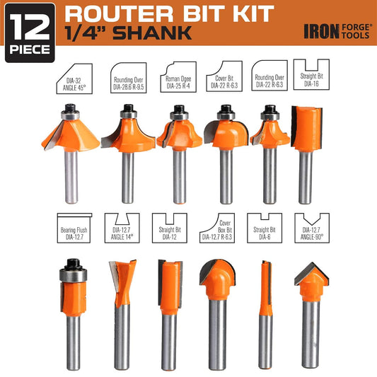 12-Piece 1/4 Inch Shank Router Bit Set for Woodworking, Home Improvement, and DIY Projects - Accessories for Woodworking by Iron Forge Tools