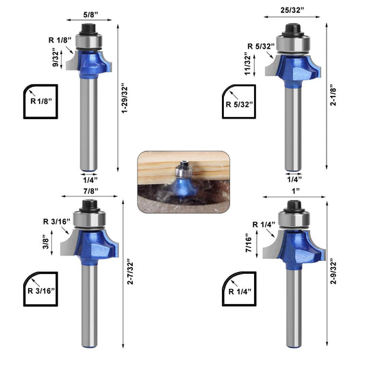 4PCS 1/4 Inch Shank Blue Roundover Carbide Wood Router Bit Set for Woodworking by VIKITON